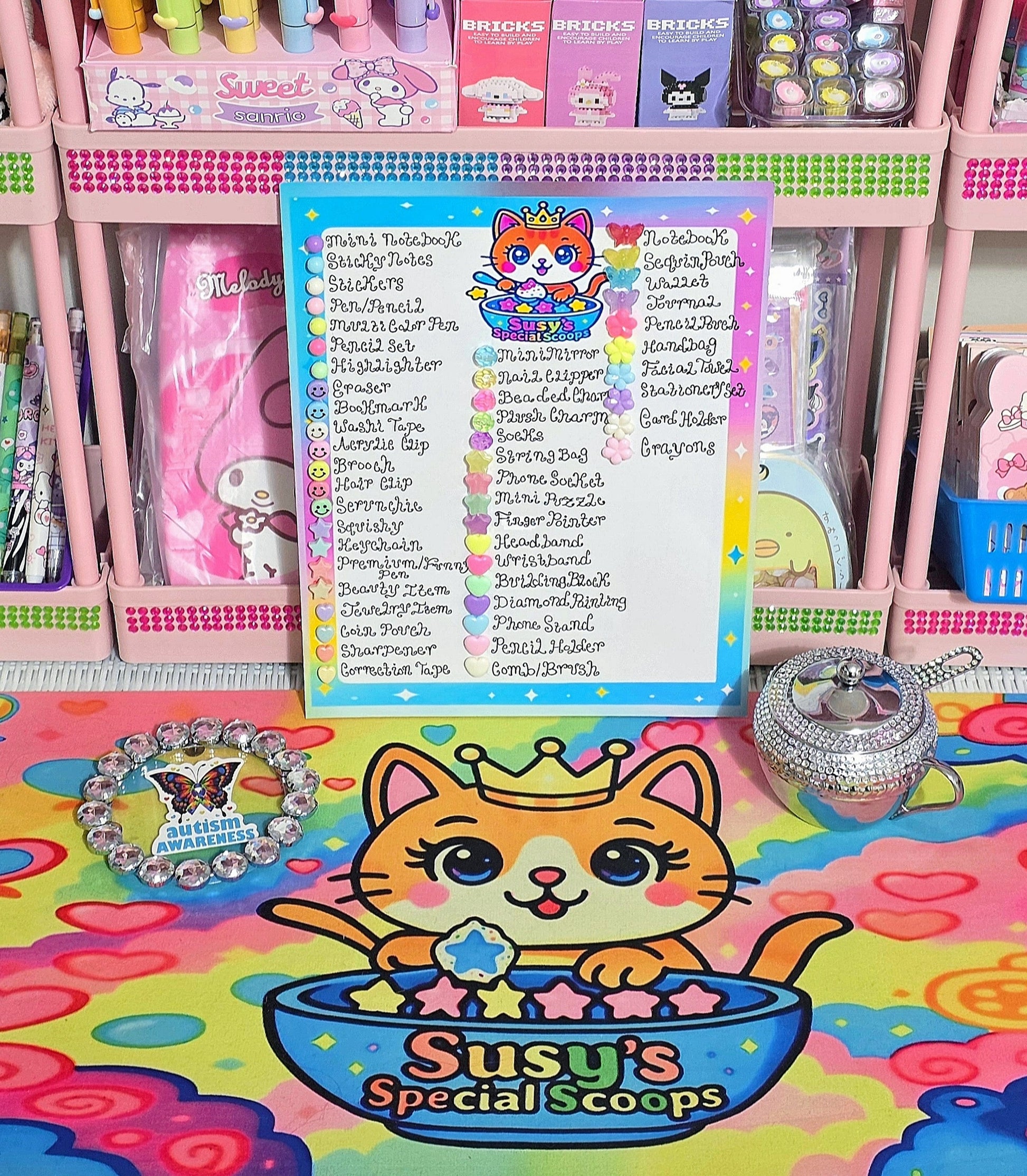 💖 Susy's Special Scoops is a mystery, with atleast 20 items included in each scoop. The current characters I have are the adorable favorites including Hello Kitty, Kuromi, My Melody, Cinnamoroll, Pom Pom Purin, Pochacco and Capybara. I am currently working on adding more characters 💖